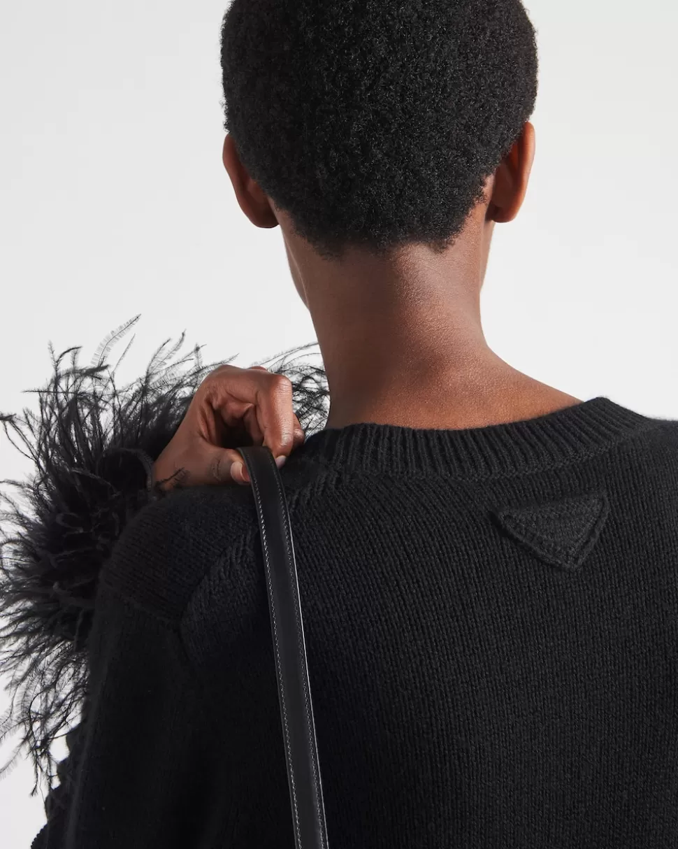 Este cárdigan híbrido, inspirado en las nuevas combinaciones de estilo, expresa la dualidad inherente a la estética de Prada. Prenda de suave y refinado cachemir con corte masculino adornada con un ribete extraíble de plumas aplicado en los puños. El logo triangular de punto completa el look con un toque icónico.