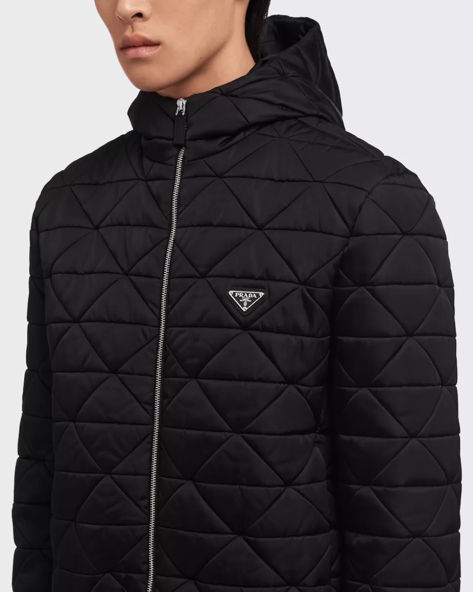 Definida por un patrón geométrico que recuerda al icónico triángulo Prada, esta chaqueta blusón con capucha se cara…