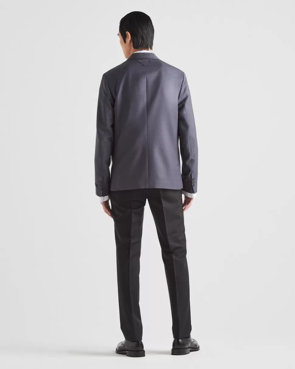 En un proceso de simplificación, las siluetas clásicas se reinterpretan con líneas elegantes realzadas con materiales de calidad. Chaqueta de lana de mohair con cierre de botonadura simple de tres botones donde se funden la sastrería de calidad con elementos contemporáneos y los detalles más emblemáticos de la marca. El logo triangular añade una nota de distinción de moderna elegancia.