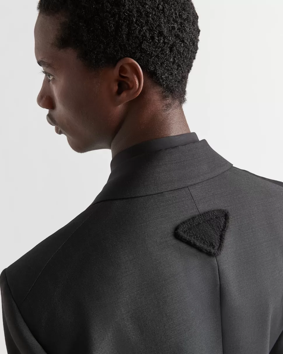Esta chaqueta de cruzado simple de lana mohair, expresión del conocimiento especializado de la marca, se caracteriza por su confección de sastrería y una línea recta de aire retro que, en combinación con detalles refinados como los bolsillos de ojal con solapa, refleja el alma híbrida de las colecciones Prada. El logo de punto en la parte posterior añade un toque contemporáneo a la prenda.
