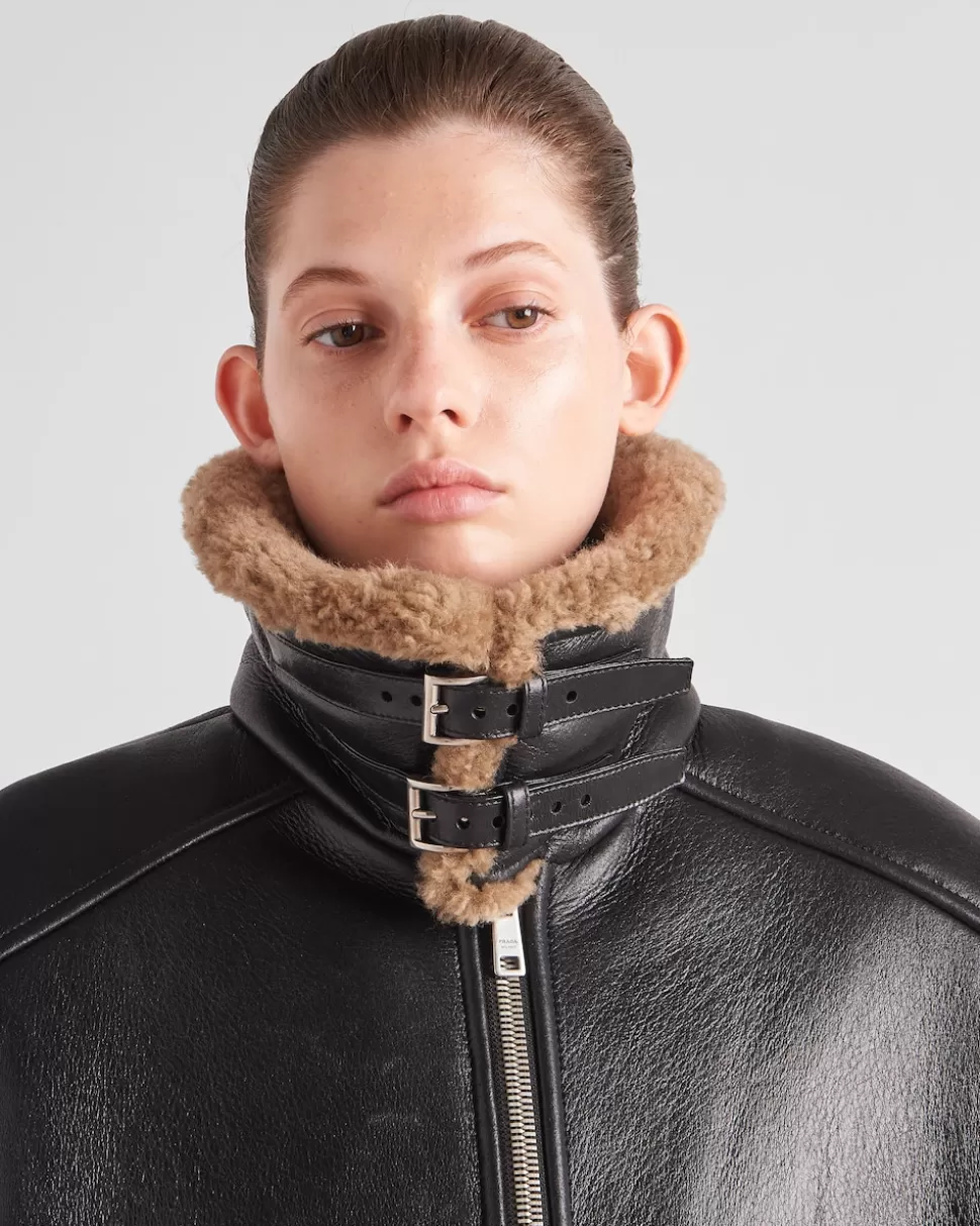 Chaqueta de piel vuelta con hombros prominentes y estilo holgado, que evoca las líneas de la icónica chaqueta bomber de Prada. Esta prenda se presentó durante el desfile de mujer OI22 y se caracteriza por elegantes detalles, como el cuello con tiras y hebillas. El logo de tela decora el modelo, añadiendo un toque icónico.