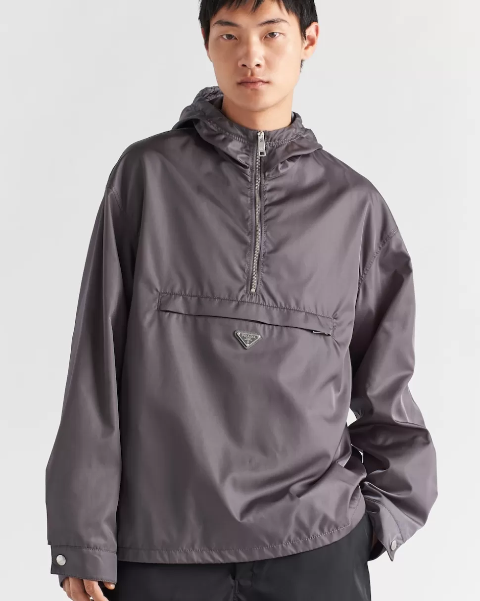 Esta chaqueta técnica y deportiva de diseño moderno está confeccionada en Re-Nylon, un tejido de nylon regenerado totalmente revolucionario. El logo triangular de metal esmaltado decora esta prenda de líneas minimalistas con capucha y cuello con cremallera, en una combinación de elementos funcionales y gran versatilidad. Para un cuidado sostenible del producto, conservar sus características y reducir el impacto medioambiental, se recomienda no lavarlo con demasiada frecuencia, dejarlo airear después de cada uso y confiar su limpieza en seco a una tintorería ecológica especializada.