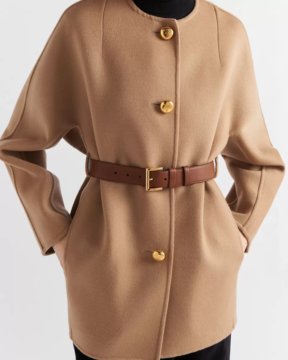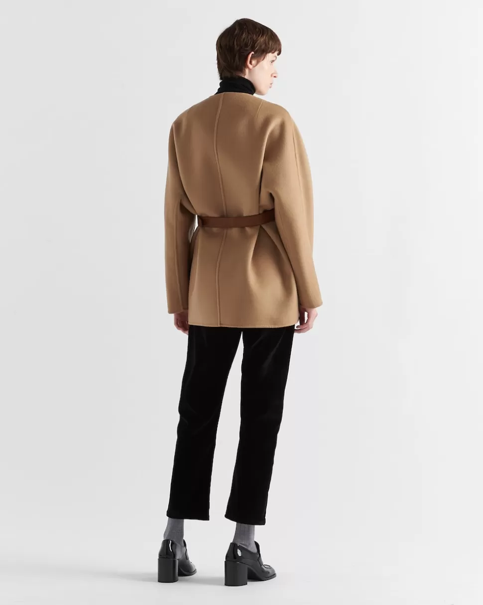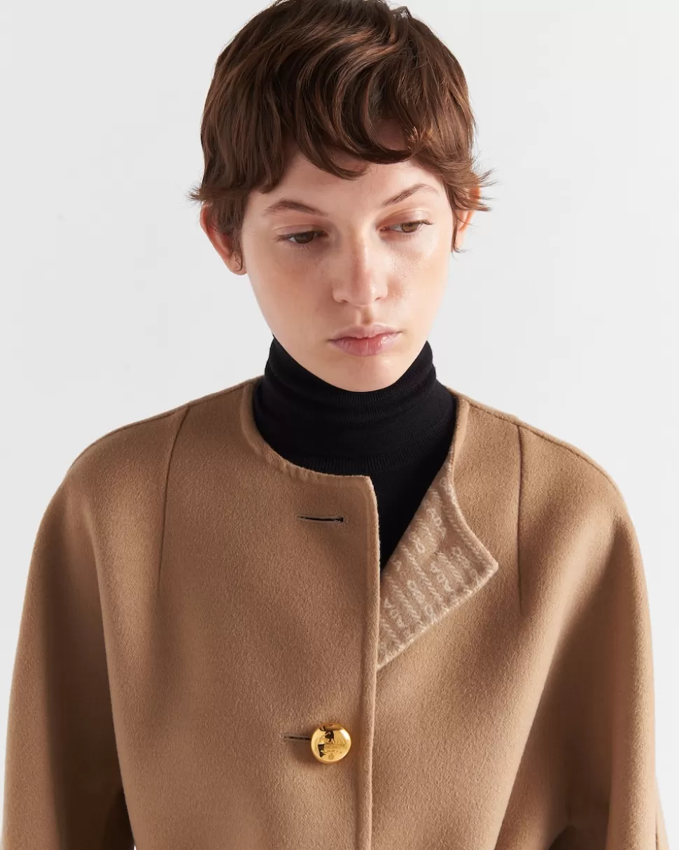 Las líneas elegantes y minimalistas caracterizan este chaquetón sin cuello confeccionado en lana doble de diseño versátil y distinguido.