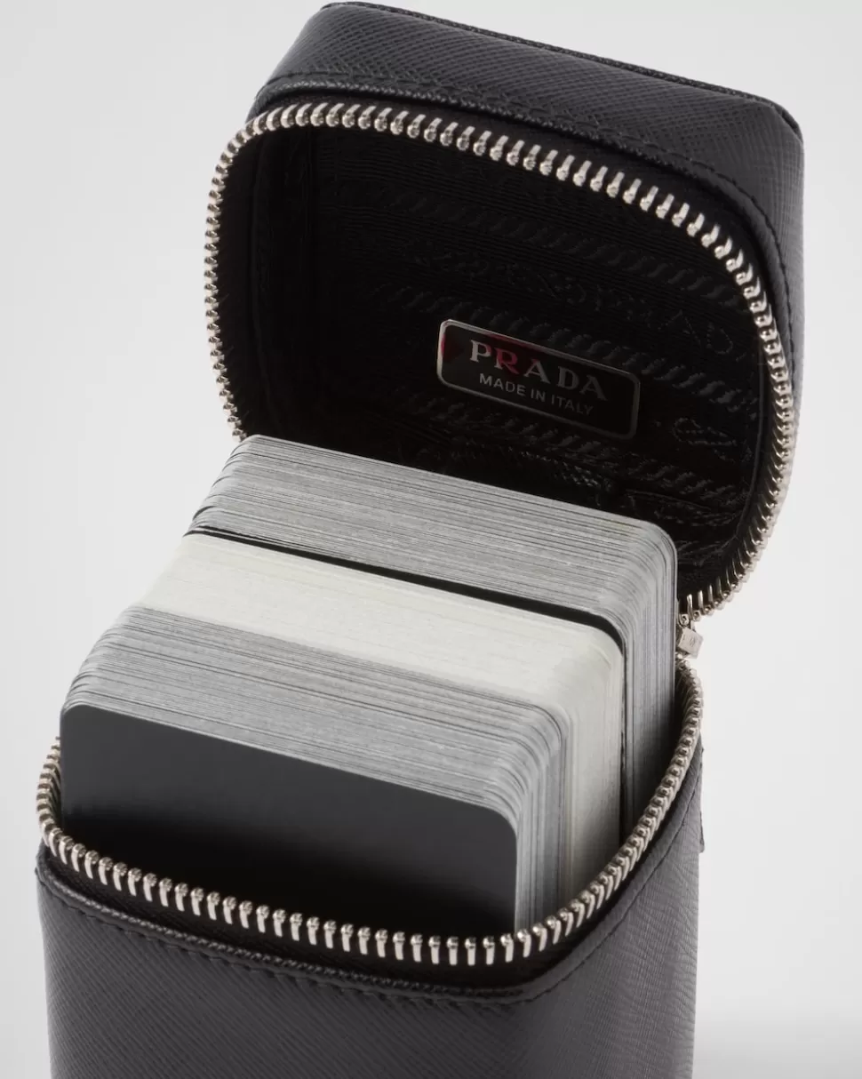 Este juego de cartas incluye tres barajas y viene en un estuche elegante de piel Saffiano, uno de los materiales icónicos de Prada: una piel de becerro de alta calidad con efecto desgastado y acabado encerado. El accesorio se completa con el logo.