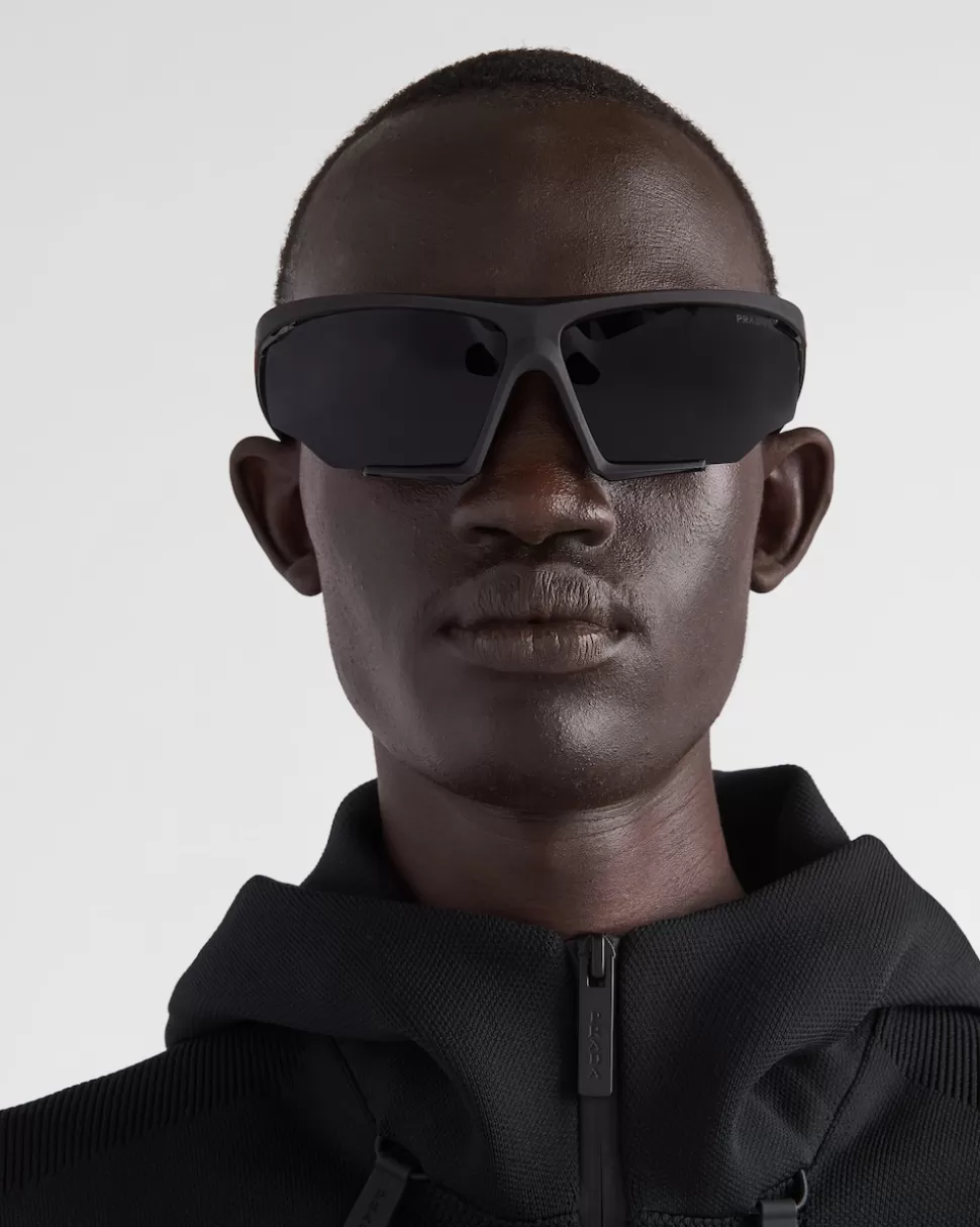 Gafas de sol de fibra de nylon que se caracterizan por un moderno diseño envolvente. El frontal se ve realzado por unas atrevidas lentes curvas con un sistema de ventilación único en la parte superior. Las patillas reflejan los códigos deportivos de la marca gracias al innovador mecanismo de bloqueo que se activa cuando están cerradas. Logo Prada Linea Rossa.
