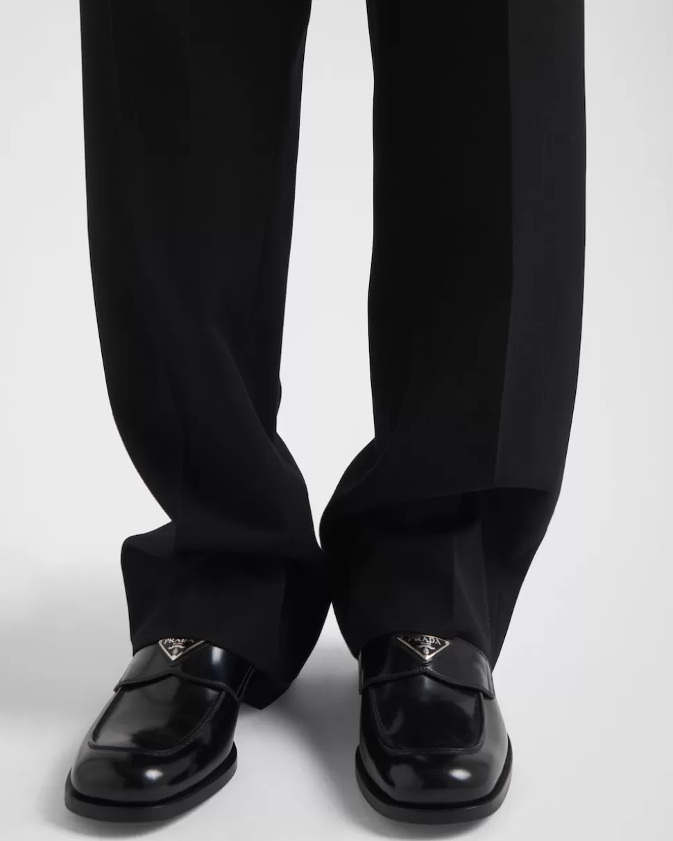 Una nueva interpretación de los mocasines estilo antifaz. Mocasines de estilo elegante elaborados en piel cepillada, un material icónico de la marca desde los 90, vinculado tradicionalmente al mundo del lujo. Adornados con el logo introducido por primera vez en 1913 en los baúles diseñados por Mario Prada.