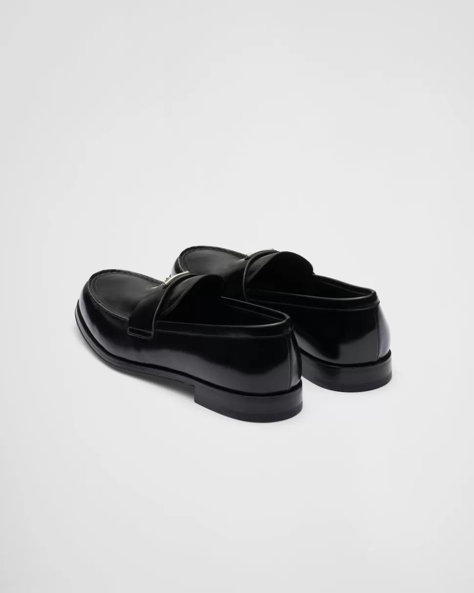 Estos mocasines de piel cepillada, caracterizados por su silueta estilizada, representan una tradición anacrónica con elementos elaborados a mano que se combinan con un encanto moderno. El logo de la marca, que apareció por primera vez en los baúles diseñados por Mario Prada en 1913, destaca en la parte frontal.