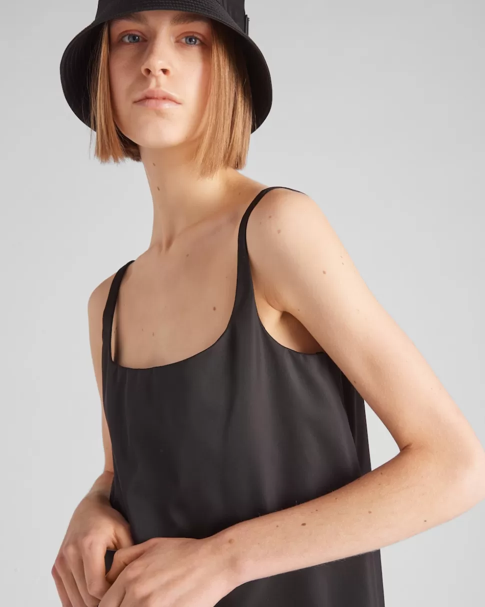 Este vestido con vuelo está confeccionado en el innovador Re-Nylon, una fibra regenerada elaborada a partir de residuos plásticos reciclados y purificados recuperados de los océanos. La prenda sin mangas con cuello redondo tiene un carácter elegante y contemporáneo, un estilo híbrido típico de Prada. Para un cuidado sostenible del producto, conservar sus características y reducir el impacto medioambiental, se recomienda no lavarlo con demasiada frecuencia, dejarlo airear después de cada uso y confiar su limpieza en seco a una tintorería ecológica especializada.