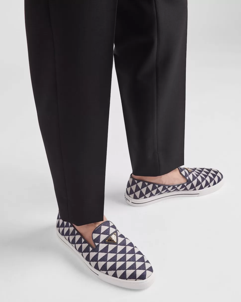 Los elementos gráficos que siempre han caracterizado las colecciones de Prada se reflejan en este calzado deportivo sin cordones. El icónico logo triangular, reinterpretado con un patrón gráfico sobre el tejido bordado, realza el modelo.