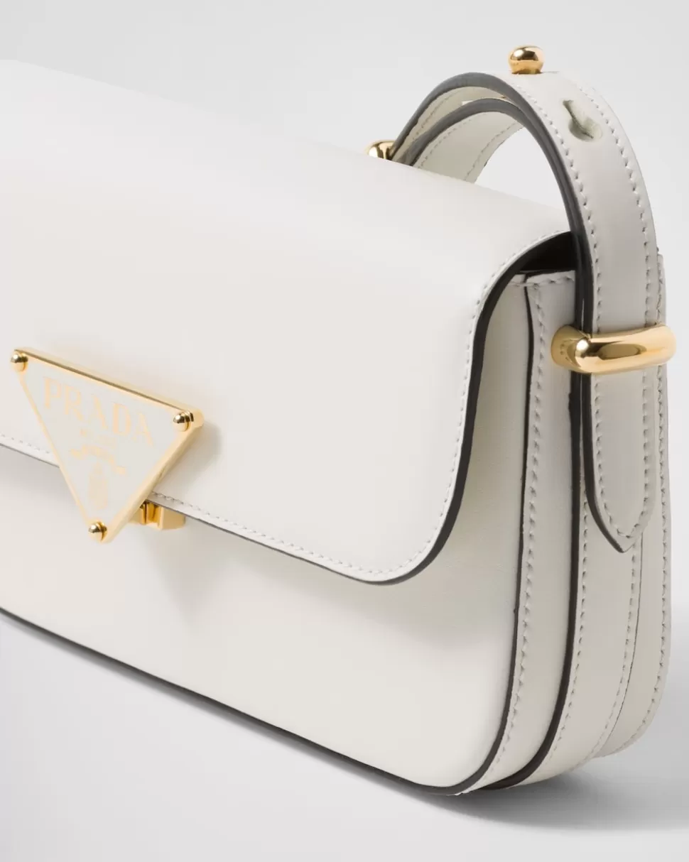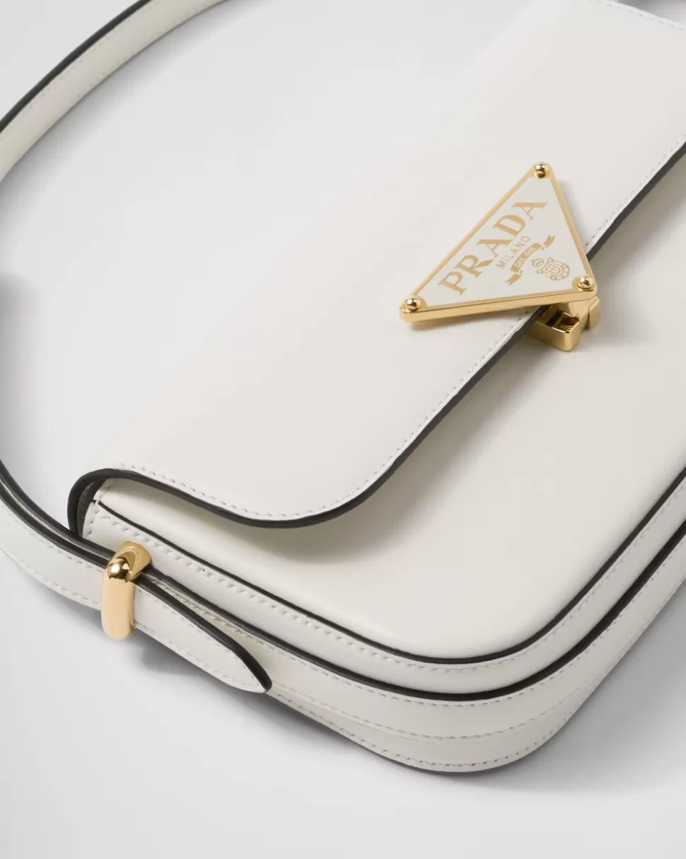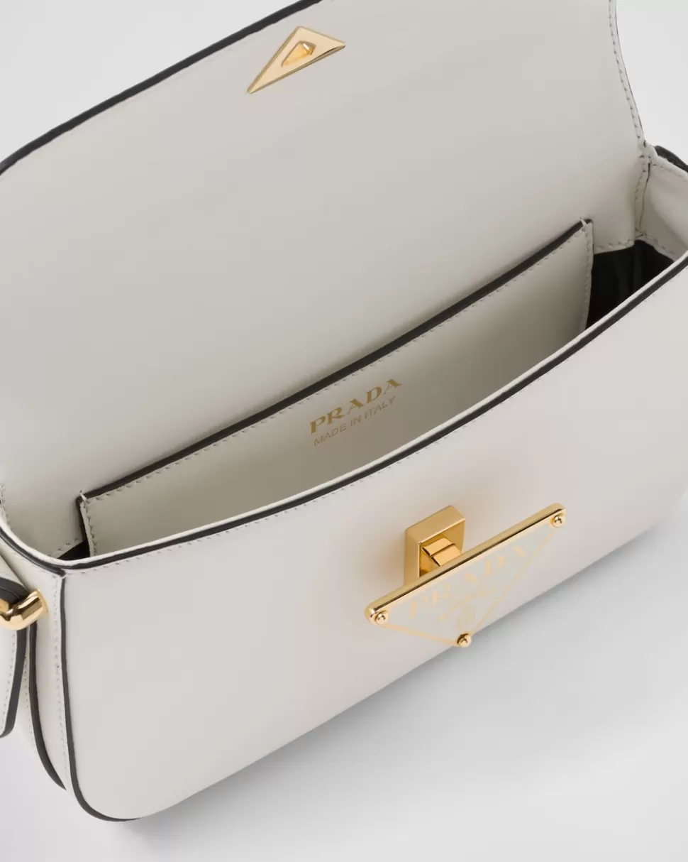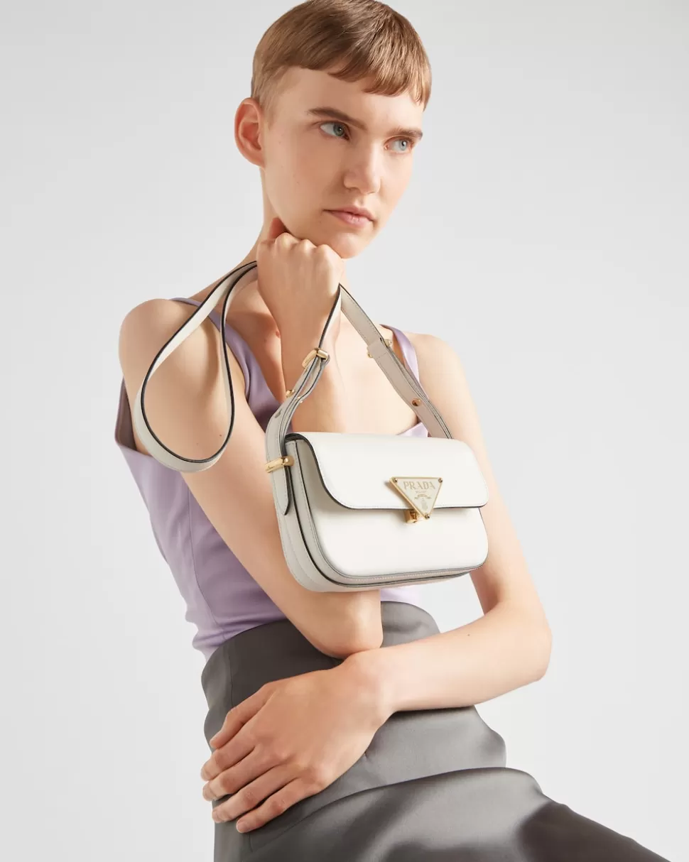 Esta bandolera de líneas compactas propone un juego con el concepto de sencillez que combina versatilidad y elegancia en un modelo refinado. El accesorio es de piel y cuenta con una bandolera extraíble, y está adornado con herrajes de metal, como el icónico logo triangular en el cierre delantero.