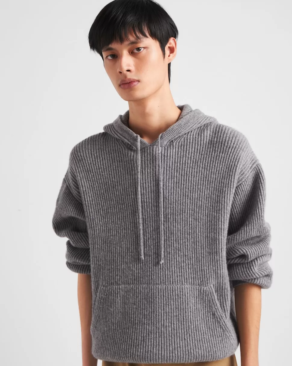 El diseño deportivo de esta sudadera con capucha se ha enriquecido con el toque suave y sofisticado del punto acanalado de cachemir. La prenda de corte holgado presenta un gran bolsillo tipo pouch y se ha rematado con el sencillo pero icónico logo triangular de punto en la parte posterior.