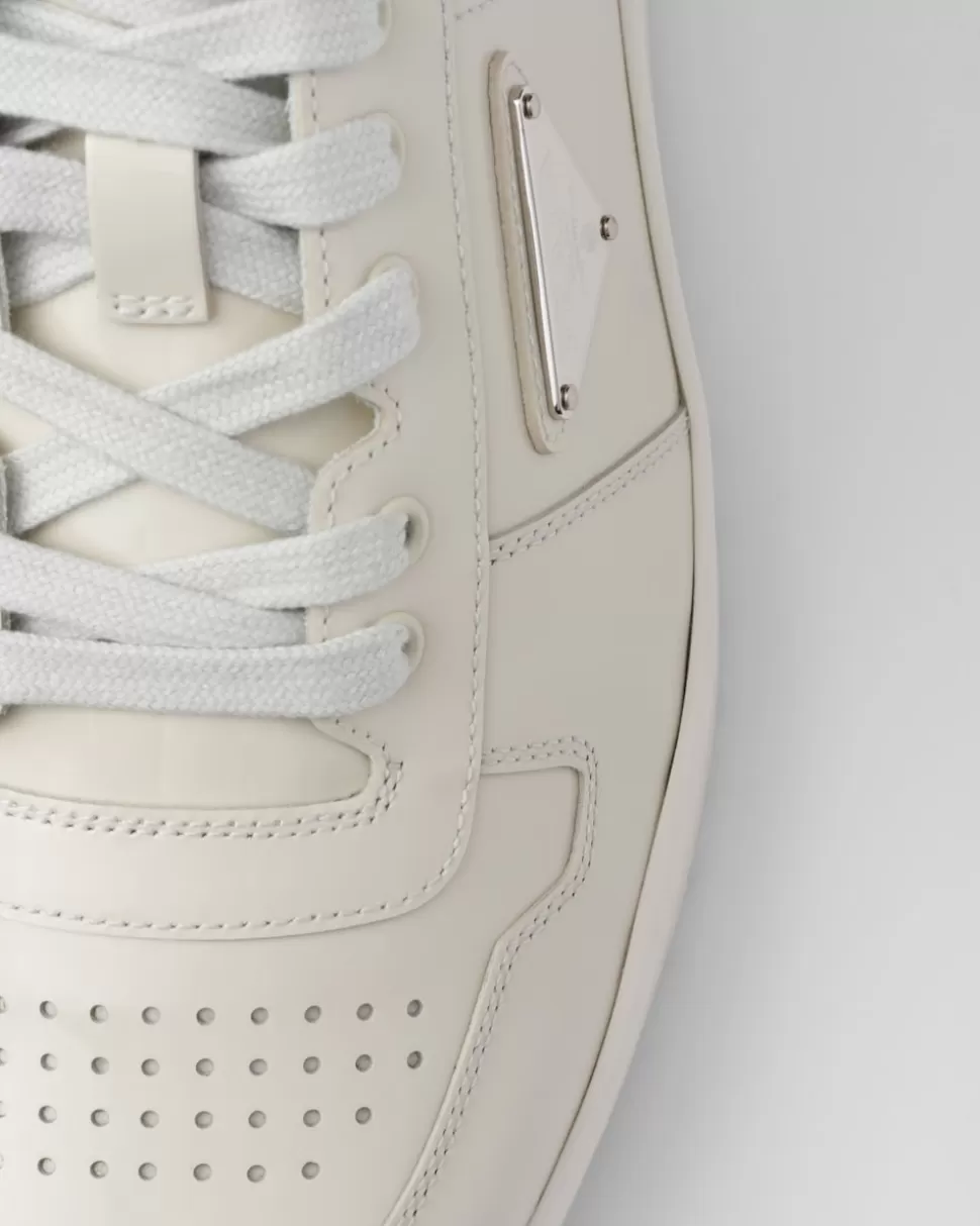Estas zapatillas deportivas de piel ofrecen diferentes interpretaciones del logo Prada, que aparece en la lengüeta, a lo largo de la ligera suela de goma y en forma de triángulo de metal esmaltado que adorna el lateral del empeine.
